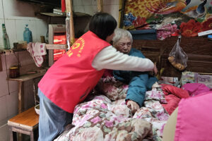 “小桃子”紧跟“嬷嬷们”走入蜿蜒的旧巷,一栋栋小矮楼,一间间破旧的棚户出现在我们眼前,在这南通的老弄堂里居住着50多户独居高龄老人。我们分成5个小组随嬷嬷服务队入户服务,为他们打扫卫生,给他们送去新年对联,与老人们唠家常,了解他们的生活状况和需求。他们有些长年卧床,有些口齿不清,有的是独居的退伍军人,看到我们,那满脸的皱纹都笑成了花,纷纷表示,期待小桃子们常来看看他们。
